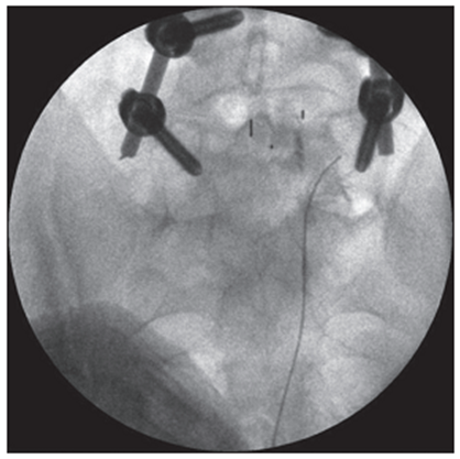 Figure 5. Intraoperative X-ray of the lumbar spine in frontal projection. Puncture of the first sacral foramen and spread of contrast along the root S 1 |